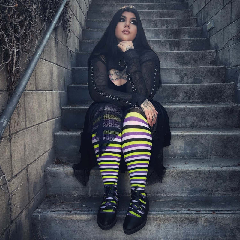 Green, purple and black stripes coil around the legs in Viper, a brand new pair of striped tights. Epic all year round, Viper tights keep you warm when it's cold and cool when it's warm, with aerated yarn that's breathable and moisture-wicking. Comfy enough to wear all day and night, these are striped tights that really fit.