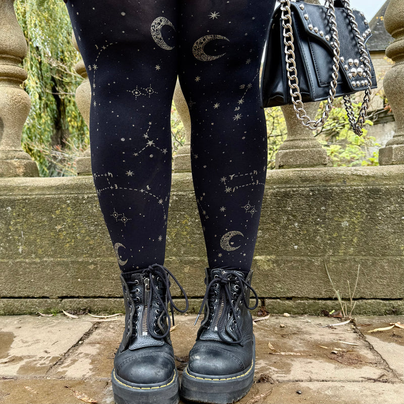 Hallow-queen are the perfect wearble witchy tights. A black 80 denier base with dreamy moon and stars design in gold glitter. Perfect all year round thanks to breathable yarn. No digging, in, no rolling down or sagging. Subtle enough to be worn for all occassions, these are a hidden gem that you need in your tights collection.