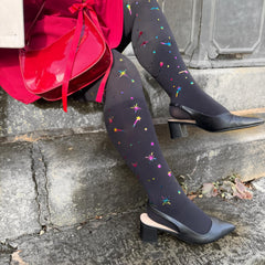 Get ready to sparkle with StarFall, the festive tights that bring the night sky right to your wardrobe. These cosy 80 denier black tights are scattered with multicoloured shiny foil stars and playful comet trails, creating a celestial scene that feels joyful, enchanting and completely unique. Slip them on and you are instantly wrapped in the wonder of the solar system, ready to shine through the whole holiday season.