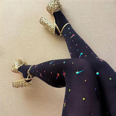 - Black 80 denier base with multicoloured foil stars and comet motifs