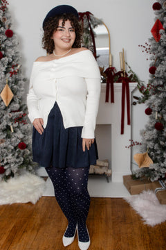 - Navy 80 denier base with crisp white polka dots for timeless festive charm