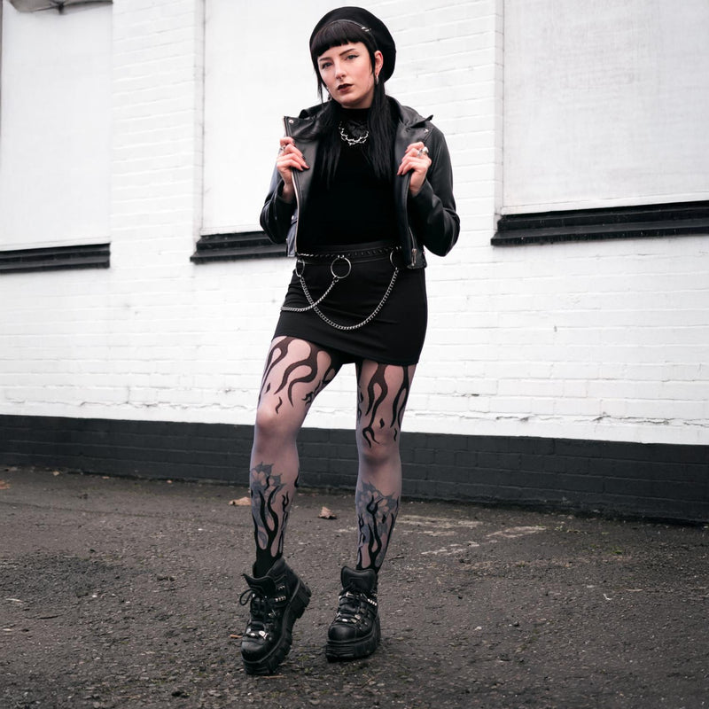 Turn up the heat with Flames, our mixed denier tights that are made for burning bright, moving forward and leaving what no longer serves you in the ashes. Set on a soft mid grey base, these tights feature bold black flames licking up from the feet and flickering down from the waist, wrapping your legs in movement, energy and intention.