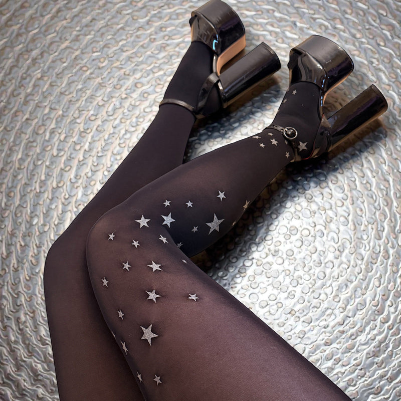 Star Leg Wrap tights bring quiet star power to your wardrobe with a trail of shimmering silver glitter stars wrapping around one leg, set against a classic black base. The other leg stays solid black, creating a striking contrast that feels intentional, modern, and effortlessly cool.