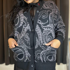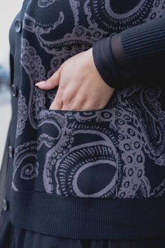 The Kraken's Embrace Cardigan is a mesmerising knit inspired by the mysteries of the deep. Our talented in-house team designed this detailed pattern, featuring slate-drawn tentacles twisting across a rich black base. It's a quietly striking alternative piece that rewards a closer look.