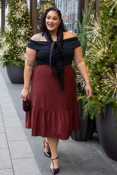 Swish onto the dancefloor with the Bordeaux Lurex Tiered Midi Skirt, your twirl-ready festive favourite. Deep burgundy lurex sparkles on the outer surface like mulled wine under fairy lights, falling in one sleek main tier before a playful lower frill kicks out for movement and fun. The frill dips lower at the back to elongate legs and frame every step in effortless glamour.