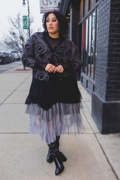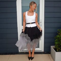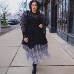 Some pieces don't just turn heads. They cast a spell. The Ombre Mesh Maxi Skirt in Black flows through three smoky shades of light grey, dark grey and deep black, tiered, ethereal and impossible to look away from. Floaty, sheer and full of movement, it catches the light and swishes with every step.