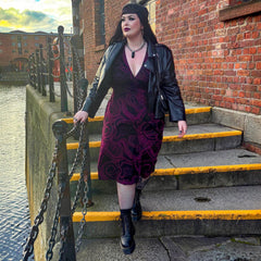 If you're looking for a black dress that actually has something to say, this is it. The Kraken's Embrace Wrap Dress is bold, flattering and made for your daily rotation, with custom tentacle artwork in deep cherry coiling across a black base. Gothic romance meets everyday wearability, and it does both brilliantly.